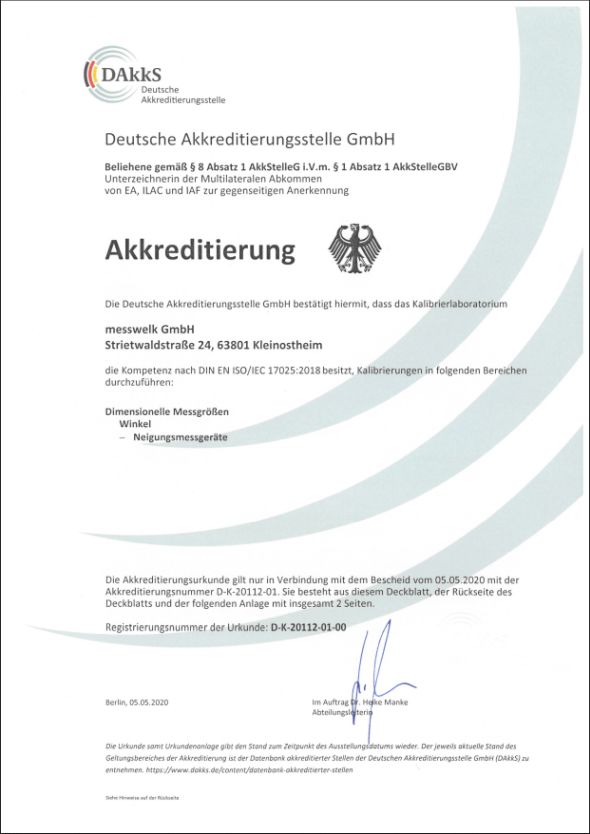 Die Deutsche Akkreditierungsstelle DAkkS erteilt unserem Kalibrierlaboratorium die Akkreditierung nach DIN EN ISO/IEC 17025:2018 für Neigungsmessgeräte.
